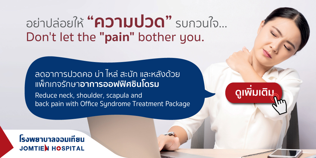 แต่หากลองปรับเปลี่ยนพฤติกรรมการทำงานแล้วยังพบปัญหา อาการปวดเมื่อยสามารถเข้ามารับการวินิจฉัยกับคุณหมอและนักกายภาพบำบัดผู้เชี่ยวชาญของโรงพยาบาลจอมเทียนได้ เราพร้อมให้คำปรึกษา บำบัด รักษาและฟื้นฟูครอบคลุมทุกกลุ่มอาการด้วยมาตรฐานระดับสากล