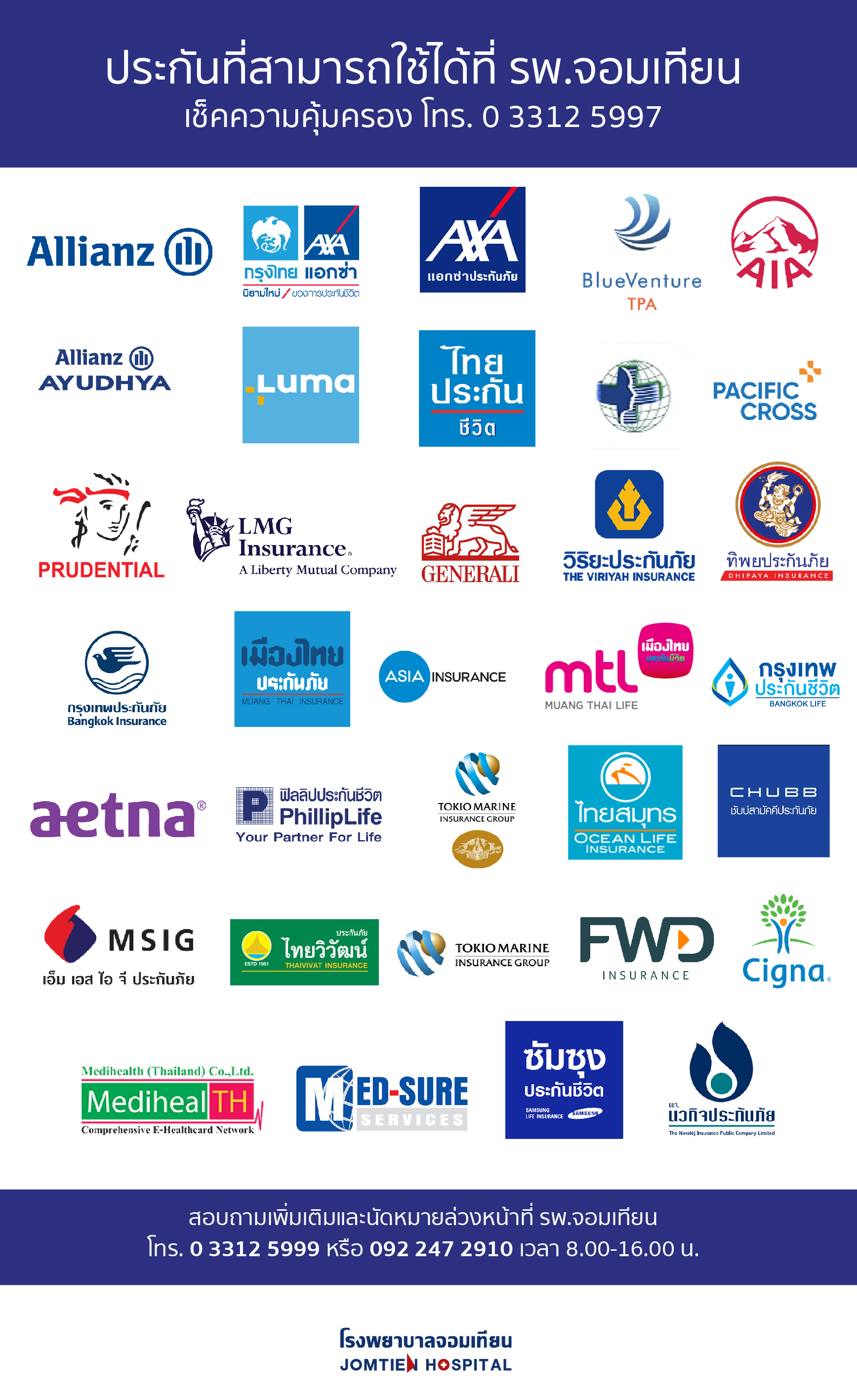 โดยสิทธิพิเศษการบริการผู้ป่วยที่มีประกันและใช้รับบริการกับโรงพยาบาลจอมเทียนมีดังต่อไปนี้